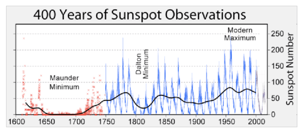 Dans le schéma de l’histoire occidentale, la période où la civilisation romaine s’est effondrée a été appelée « l’âge des ténèbres », tandis que la période qui marque l’essor de la civilisation moderne est appelée « période des Lumières ». Comme le montre l’illustration, l’activité solaire croissante est en corrélation avec la culture de la raison et de la liberté des Lumières, illustrée dans la pensée des puritains anglais, depuis la philosophie naturelle de Newton et l’idéal de liberté de John Locke (1680) jusqu’aux pères fondateurs des États-Unis en 1776 avec la Déclaration d’indépendance.