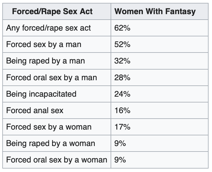 Bivona JM, Critelli JW. 2009. The nature of women’s rape fantasies: an analysis of prevalence, frequency, and contents. J Sex Res. 46(1):33-45. (Source)