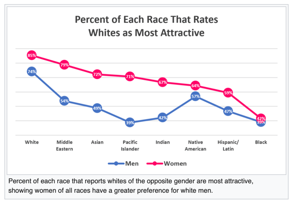 Toutes les races s’accordent à dire que les Blancs sont les plus attirants, mais les femmes préfèrent les blancs bien plus que les hommes ne préfèrent les blanches.