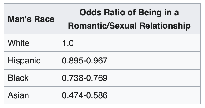« Les hommes asiatiques, mais pas les hommes noirs ou hispaniques, présentent des probabilités d’engagement significativement plus faibles que les hommes blancs. Plus précisément, ils ont environ deux fois moins de chances d’être actuellement engagés que les hommes blancs ».