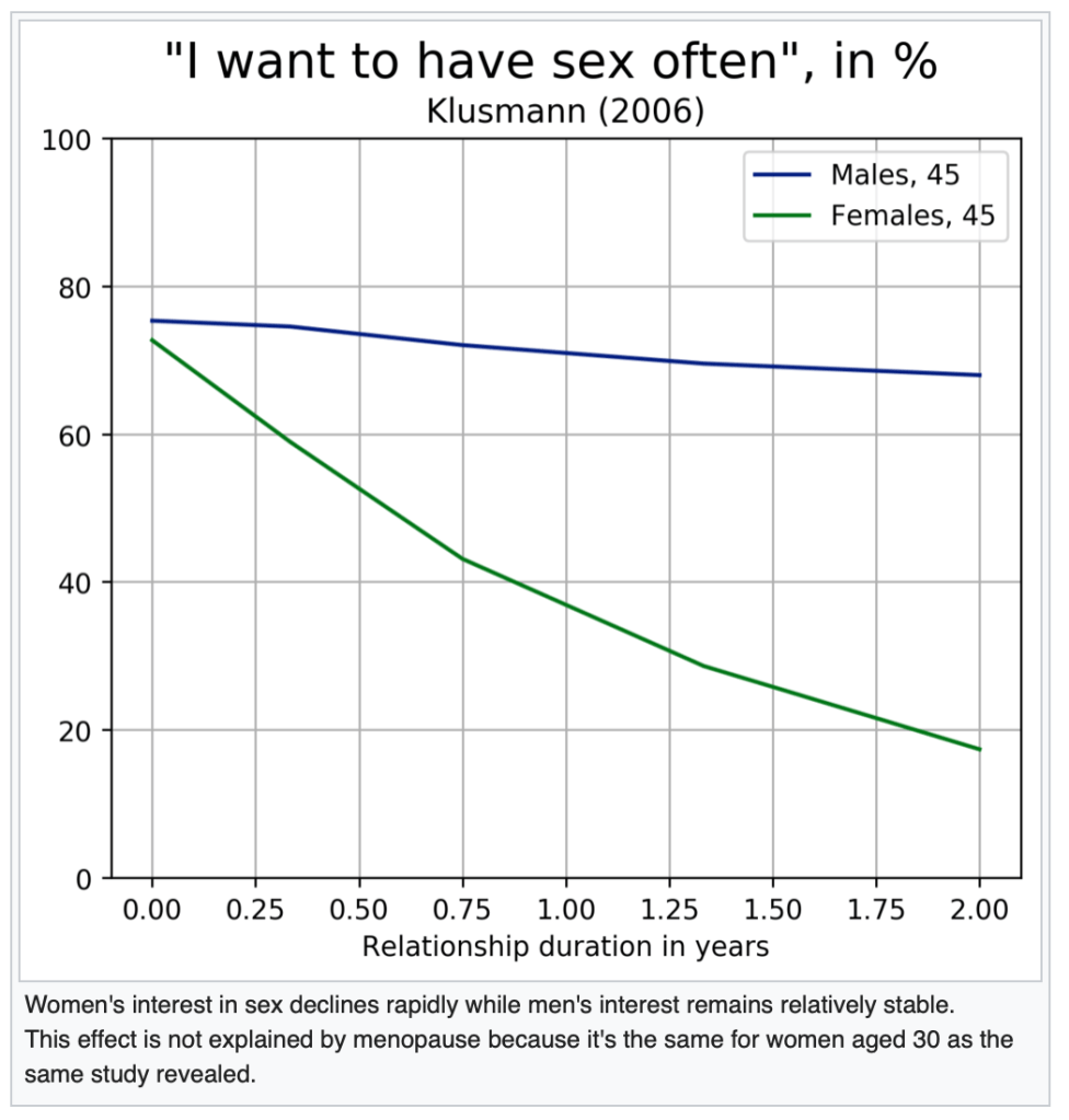 Toutefois, l’examen des facteurs modifiant la relation entre le sexe, la durée du partenariat et la motivation sexuelle a révélé que le désir sexuel féminin diminuait rapidement après la cohabitation, alors qu’il ne diminuait que légèrement lorsque la femme vivait séparée de son partenaire masculin. Il a également été constaté que le désir sexuel féminin diminuait moins lorsque le partenaire masculin avait un niveau d’éducation plus élevé que le partenaire féminin (hypergamie, donc).