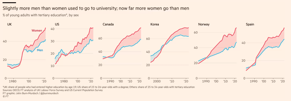 Et pire encore, au-delà de la stabilité des relations (qui n’est d’ailleurs déjà pas exceptionnelle dans les années 2020 du fait de la prévalence du « triptyque de la mort » Tinder – Onlyfans – Instagram) c’est la stabilité de la société toute entière qui est gravement menacée. En effet, non seulement la création des relations elle-même sera affectée, car un nombre croissant de femmes diplômées devront faire face à une pénurie de partenaires viables sur le plan socio-économique, et ont moins besoin que jamais de s’associer à un homme pour obtenir un soutien financier, mais en plus, avec des trajectoires socio-économiques qui prennent des directions différentes, une minorité croissante de jeunes hommes et de jeunes femmes n’arriveront tout simplement plus à se comprendre.
