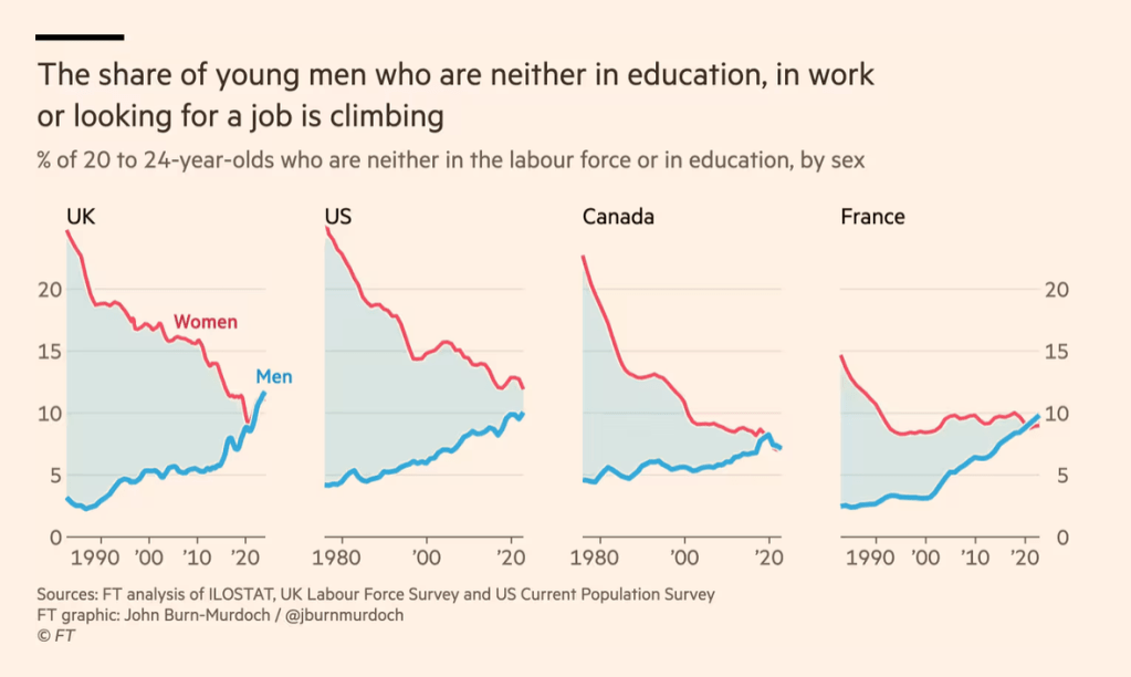 En général, le soutien des jeunes hommes aux partis populistes de droite & d’extrême-droite est en hausse parmi ceux qui n’ont ni emploi ni diplôme (ce qui n’est pas pour me déplaire). Mais au-delà de ce constat, une société qui dispose d’un trop grand nombre de jeunes hommes qui sont « hors-cadre », c’est-à-dire qui ne font pas d’études, qui n’ont pas de job et qui n’en cherche pas un, et qui, donc, gagnent peu ou pas d’argent, augmente l’instabilité politique d’une société.