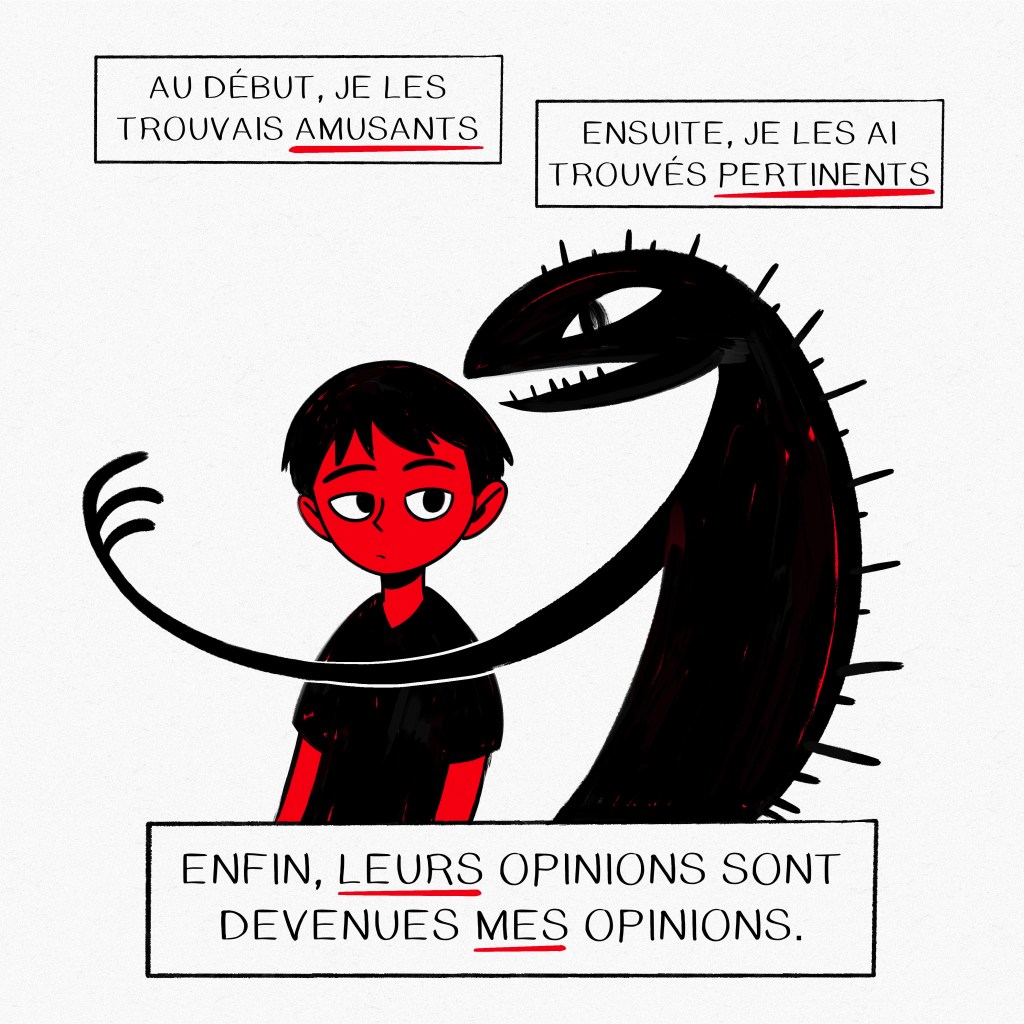 Si je résume, un type souffrant d’anxiété sociale découvre des influenceurs d’extrême-droite sur internet et réalise qu’il considère ces influenceurs comme sexiste et raciste, et en conséquence, il se met à dessiner pour se reconnecter avec ses émotions et cela lui permet de ne plus se haïr.